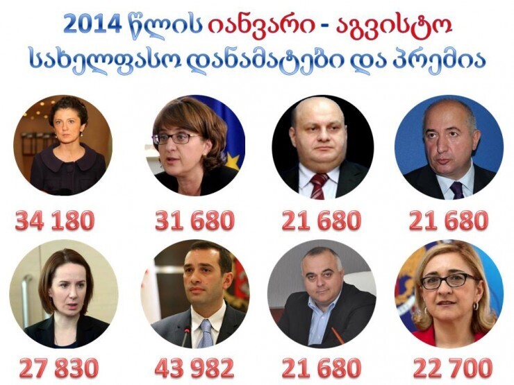 „ნაციონალური მოძრაობის“ ინფორმაციით, ბიუჯეტში სახელფასო ფონდისთვის 350 მილიონია გამოყოფილი. 2014 წლის 8 თვის განმავლობაში კი მთავრობის წევრებმა სამ მილიონზე მეტი ლარი აიღეს და აქედან ნახევარზე მეტი პრემიისა და სახელფასო დანამატების სახით.