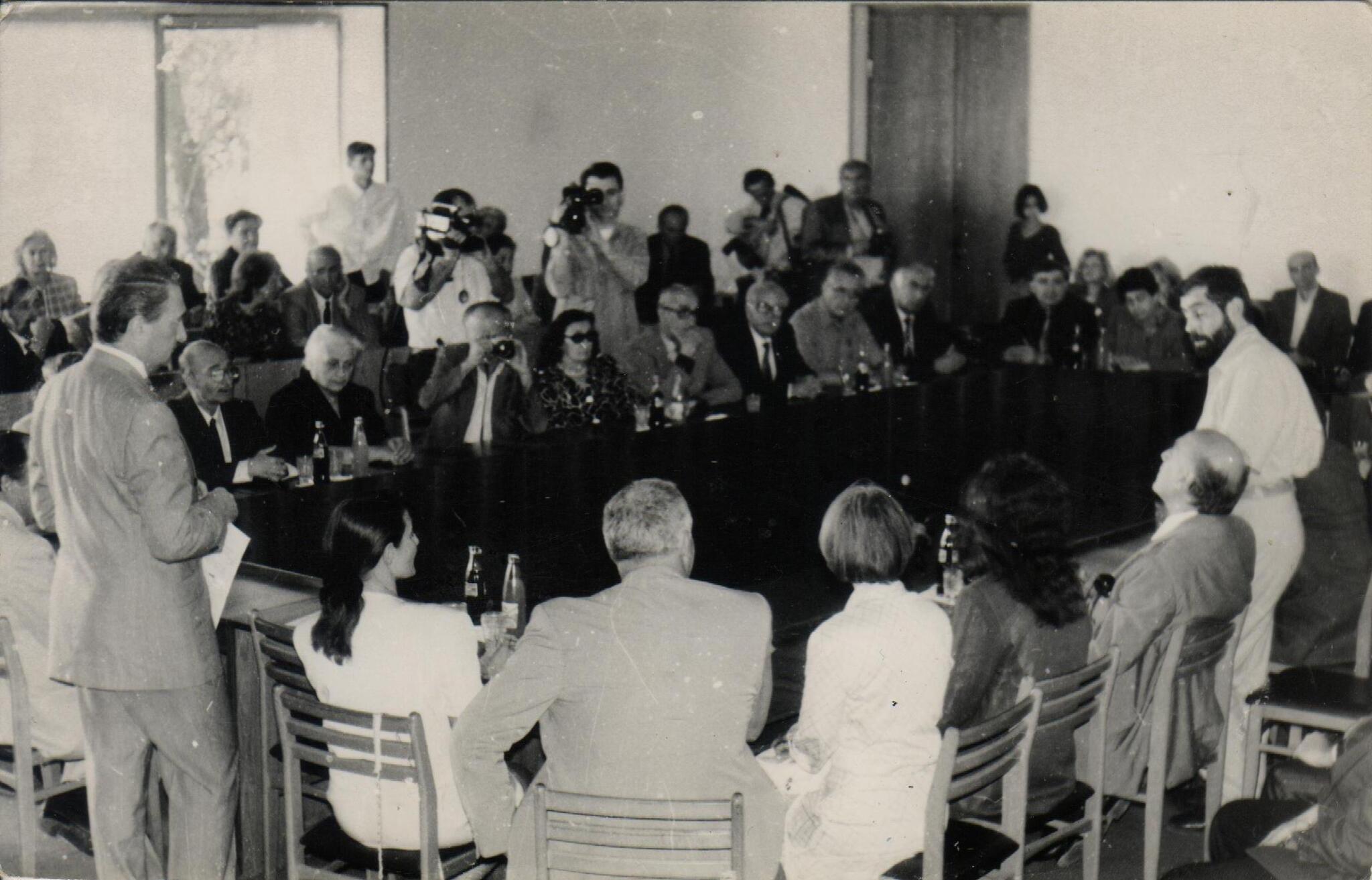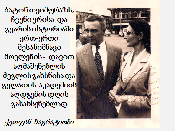 1995 წლის 22 სექტემბერს, ,დავით აღმაშენებლის პირველი ძეგლის გახსნის მეორე დღეს. ამ ფოტოზე სწორედ ეს ისტორიული შეხვედრაა აღბეჭდილი.გადაღებულია ქუთაისის მერიის სხდომათა დარბაზში.