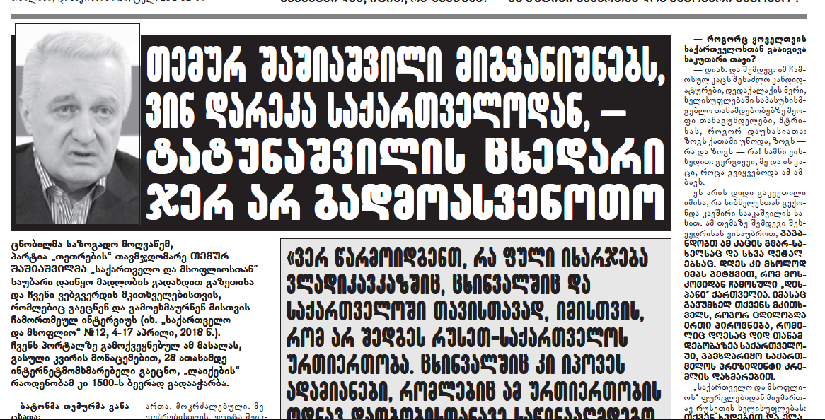 ცნობილმა საზოგადო მოღვაწემ, პარტია “თეთრების” თავმჯდომარე თემურ შაშიაშვილმა “საქართველო და მსოფლიოსთან” საუბარი დაიწყო მადლობის გადახდით გაზეთისა და ჩვენი ვებგვერდის მკითხველებისთვის, რომლებიც გაეცნენ და გამოეხმაურნენ მისთვის ჩამორთმეულ ინტერვიუს (იხ. “საქართველო და მსოფლიო” #12, 4-17 აპრილი, 2018 წ.). ჩვენს პორტალზე გამოქვეყნებულ ამ მასალას, გასული კვირის მონაცემებით, 28 ათასამდე ინტერნეტმომხმარებელი გაეცნო, “ლაიქების” რაოდენობამ კი 1500-ს ბევრად გადააჭარბა.