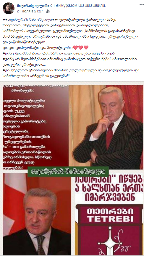თეიმურაზ შაშიაშვილი-ელიტარული ქართული სახე, ზნეობით, ინტელექტით გარეგნობით ,გამოცდილებით,სამშობლოს სიყვარულით გულანთებული ,სამშობლოს გადასარჩენად მომზადებული პროგრამით და სამართლიანი ხედვით, ერუდირებული და გაწონასწორებული ,დიდი დიპლომატი და პოლიტიკოსი