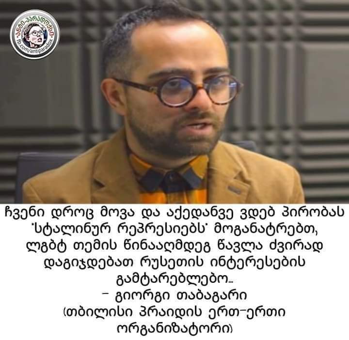 p.s. ე.წ. ლგბტ “თბილისი პრაიდის” ერთ-ერთმა ხელმძღვანელმა, გიორგი თაბაგარმა რომელიც ნაცმოძრაობის ევროპული საქართველოს, დასავლეთის მიერ დაფინანსებული არასამთავრობო ორგანიზაციების მხარდაჭერა აქვს, განაცხადა: “დრო მოვა და ე.წ. სტალინურ რეპრესიებს მოანატრებთ ლგბტ წინააღმდეგ წასვლა ძვირი დაგიჯდებათ, რუსეთის ინტერესების გამტარებლებო!