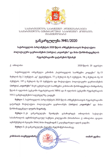 ჩვენ ვიღებთ გადაწყვეტილებას, რომ კანონმდებლობით გათვალისწინებული, პარტიის უმაღლესი ორგანოს – კონგრესი ჩატარდეს სამ სესიად. პირველი შედგება 25 აგვისტოს, მეორე – არჩევნების წინ, მესამე – არჩევნების შემდგომ.