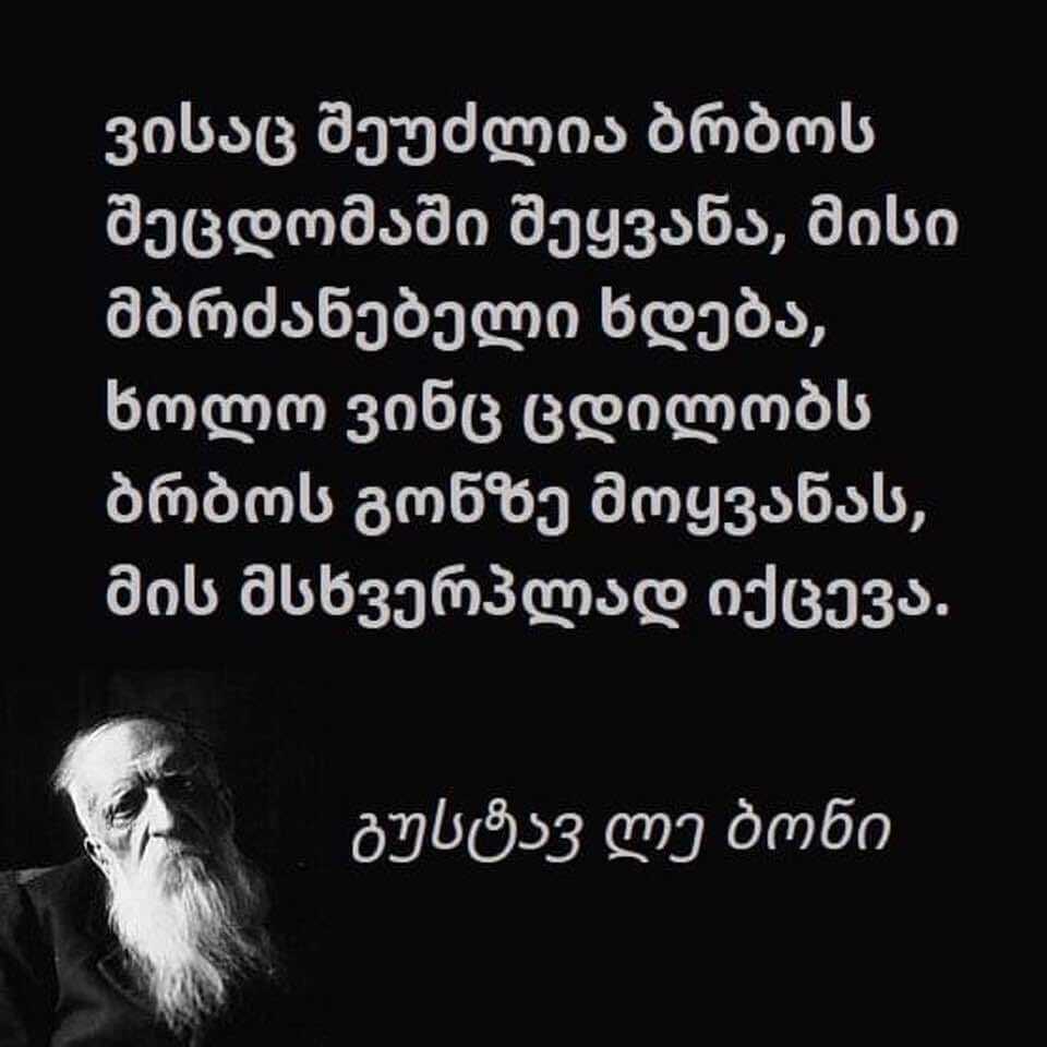 მინდა ყურადღება მიაქციოთ გუსტავ ლე ბონის მოსაზრებას.ჩვენ გვინდა,მეცნიერთა ამ მონდომებამ ხალხი დააფიქროს და მატყუარა კი არ დაისვას მბრძანებლად,არამედ თვითონ იქცეს ქვეყნის ბატონ-პატრონად.თუ ამას ხალხი არ გააკეთებს,გვირჩევნია ჩვენ ვიყოთ მსხვერპლი,ვიდრე მატყუარობით მივიდეთ ქვეყნის სათავეში, როგორც ეს 30 წელია ხდება და ქვეყანა უფსკრულის პირას მიიყვანა, ხალხის ცხოვრება გაუსაძლისი გახადა!