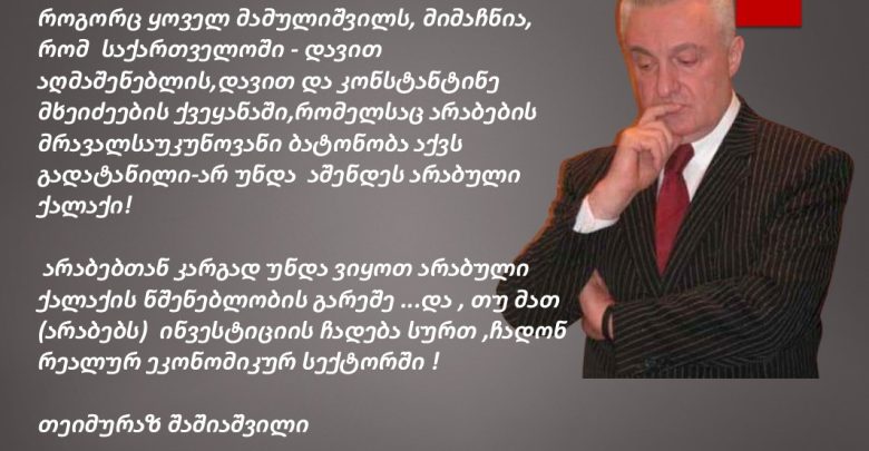 როგორც ყოველ მამულიშვილს,მეც როგორ მინდა,რომ საქართველოში – დავით აღმაშენებლის, დავით და კონსტანტინე მხეიძეების ქვეყანაში,რომელსაც არაბების მრავალსაუკუნოვანი ბატონობა აქვს გადატანილი-არ აშენდეს არაბული ქალაქი, რომ ვიყოთ არაბებთან კარგად არაბული ქალაქის მშენებლობის გარეშე …და , თუ ინვესტიციის ჩადება უნდათ,ჩადონ რეალურ ეკონომიკურ სექტორში !