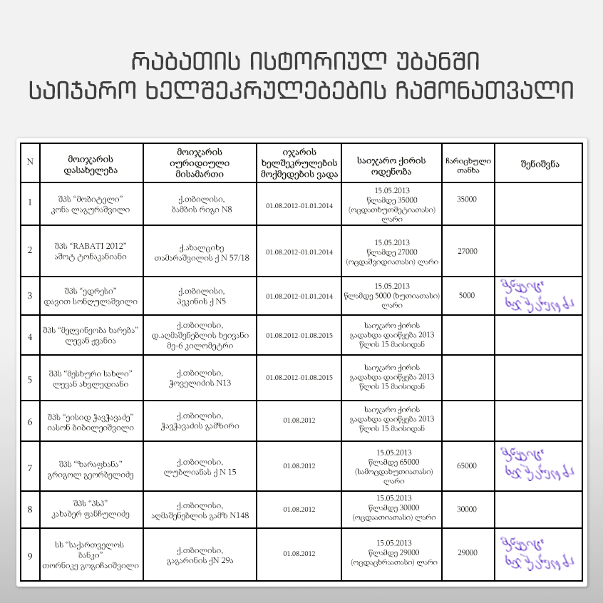 “ახალციხეში ქვესადგური „ახალციხე-500“-ის დათვალიერების შემდეგ ვეწვიეთ რაბათის ისტორიულ უბანს. გვინდოდა საკუთარი თვალით გვენახა ის მდგომარეობა, რაც ცოტა ხნის წინ სატელევიზიო სიუჟეტის სახით გავიდა, თუ როგორი დაცარიელებულია რაბათის „რეაბილიტირებული“ უბანი. სამწუხაროდ, ნაციონალური მოძრაობის მიერ აგებული ფასადური აღმშენებლობისა და ვითომ-ეკონომიკური „აღმავლობის“ კიდევ ერთი კლასიკური სქემის მოწმე გავხდით. ადგილზე მოვიძიეთ საიჯარო ხელშეკრულებების სია, სადაც ჩამოთვლილია რაბათის უბანში კომერციული ობიექტების მოიჯარეების დასახელება. ყველა მათგანს ხელშეკრულება გაფორმებული აქვს ზუსტად ერთ დღეს, ერთიდაიგივე პერიოდით და წინასწარ გადახდილია ქირა 2013 წლის 15 მაისამდე.