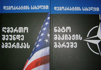 წიგნში “დემოკრატიის სახელით: “ნატო მაკიაჟის გარეშე““ ავტორიტეტულ უცხოურ გამოცემებზე (The Guardian, Washington Post, Time, International Herald Tribune, The New York Times, Newsweek, Asia Times და სხვ.) დაყრდნობით თავმოყრილია მასალა იმის შესახებ, თუ როგორ აფასებენ და რას ფიქრობენ ნატოზე საზღვარგარეთ და რას წერენ ამ ორგანიზაციაზე უცხოელი ჟურნალისტები, პოლიტოლოგები, ფილოსოფოსები, ავტორიტეტული და კვალიფიციური ექსპერტები. როგორც გამოცემის ავტორები აღნიშნავენ, წიგნის მიზანია – საზოგადოებას ობიექტური ინფორმაცია მიაწოდოს ნატოს მოღვაწეობის რეალური მიზნებისა და შედეგების შესახებ.